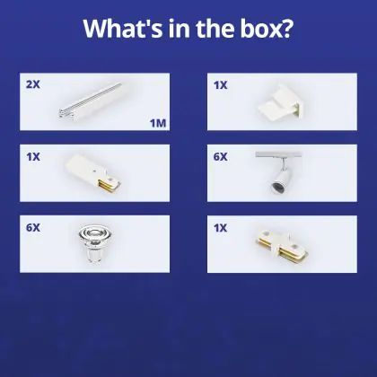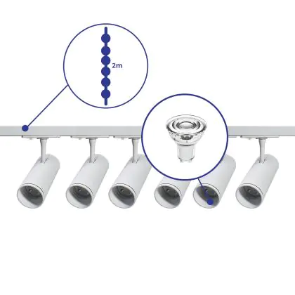 Beschreibung Komplettset 1-Phasen Rail 2 Meter Weiß | incl. 6x Spot + GU10 2700K 3W Dimmbar + Abschlusskappe, Stromanschluss und I-Verbinder