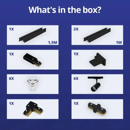 Beschreibung Komplettset 1-Phasen Rail L 1,5 x 2 Meter Schwarz | incl. 6x Spot + GU10 2700K 3W Dimmbar + Abschlusskappe, Stromanschluss und L -Verbinder
