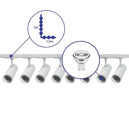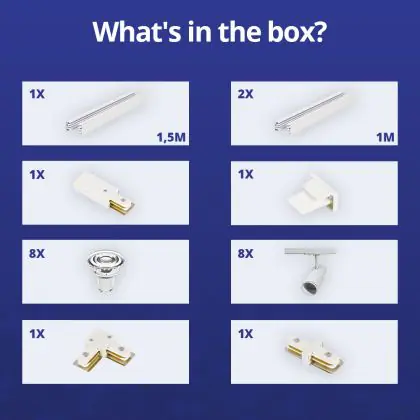| Herstellername | Complete L shaped 1-Phase Track Set White incl. 8x Spot fixture + GU10 2700K 3W Dim – 1,5 x 2 meter | |