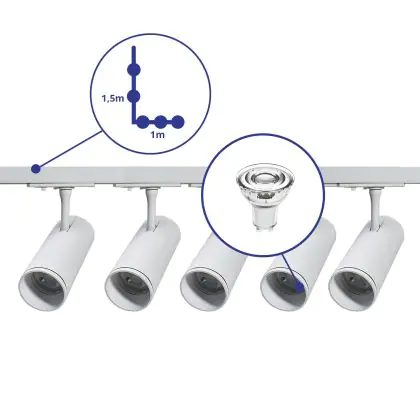 Beschreibung Komplettset 1-Phasen Rail L 1 x 1,5 Meter Weiß | incl. 5x Spot + GU10 2700K 3W Dimmbar + Abschlusskappe, Stromanschluss und L -Verbinder