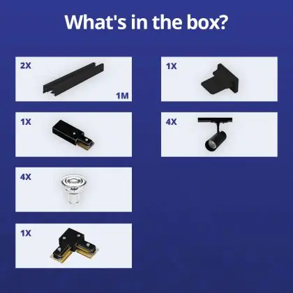 Beschreibung Komplettset 1-Phasen Rail L 1 x 1 Meter Schwarz | incl. 4x Spot + GU10 2700K 3W Dimmbar + Abschlusskappe, Stromanschluss und L -Verbinder