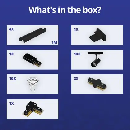 | Herstellername | Complete L shaped 1-Phase Track Set Black incl. 10x Spot fixture + GU10 2700K 3W Dim – 2 x 2 meter | |