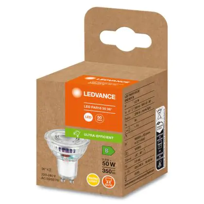 Die Ledvance Energy Efficiency Reflektor LED-Spot GU10 PAR16 2.2W 350lm 36D - 827 Extra Warmweiß |Ersatz für 50W ist eine effiziente GU10 LED-Lampe und der perfekte Ersatz für Ihre konventionelle Halogenlampe mit 50W und einem GU10-Sockel, bei welchem die zwei Stifte einen Abstand von 10 mm zueinander haben. Zudem strahlt das Produkt Licht in der Farbtemperatur 2700K - Extra Warmweiß aus und punktet durch eine lange Lebensdauer.