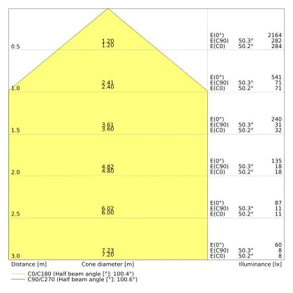 Beispiel: Wird eine Lampe mit einem Abstrahlwinkel von 60 Grad an der Decke (2,5 m Höhe) angebracht, erzeugt sie einen Lichtkegel von 2,9 Metern Durchmesser. Hat die Lampe hingegen einen Abstrahlwinkel von 120 Grad, beträgt der Lichtkegel 8,7 Meter im Durchmesser. |