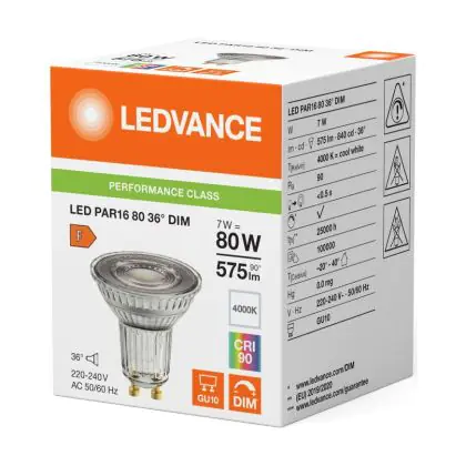 Die Ledvance LED PAR16 GU10 Reflektor 7W 575lm 36D - 940 Kaltweiß | Höchste Farbwiedergabe - Dimmbar - Ersatz Für 80W ist eine effiziente GU10 LED-Lampe und der perfekte Ersatz für Ihre konventionelle Halogenlampe mit 80W und einem GU10-Sockel, bei welchem die zwei Stifte einen Abstand von 10 mm zueinander haben. Zudem strahlt das Produkt Licht in der Farbtemperatur 4000K - Kaltweiß aus und punktet durch eine lange Lebensdauer.