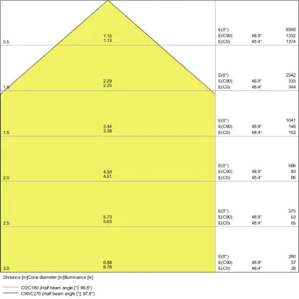 Beispiel: Wird eine Lampe mit einem Abstrahlwinkel von 60 Grad an der Decke (2,5 m Höhe) angebracht, erzeugt sie einen Lichtkegel von 2,9 Metern Durchmesser. Hat die Lampe hingegen einen Abstrahlwinkel von 120 Grad, beträgt der Lichtkegel 8,7 Meter im Durchmesser. |