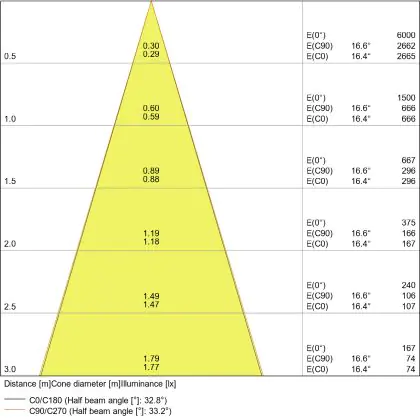 Beispiel: Wird eine Lampe mit einem Abstrahlwinkel von 60 Grad an der Decke (2,5 m Höhe) angebracht, erzeugt sie einen Lichtkegel von 2,9 Metern Durchmesser. Hat die Lampe hingegen einen Abstrahlwinkel von 120 Grad, beträgt der Lichtkegel 8,7 Meter im Durchmesser. |