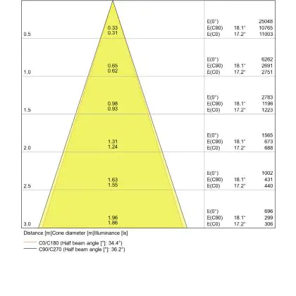 Beispiel: Wird eine Lampe mit einem Abstrahlwinkel von 60 Grad an der Decke (2,5 m Höhe) angebracht, erzeugt sie einen Lichtkegel von 2,9 Metern Durchmesser. Hat die Lampe hingegen einen Abstrahlwinkel von 120 Grad, beträgt der Lichtkegel 8,7 Meter im Durchmesser. |