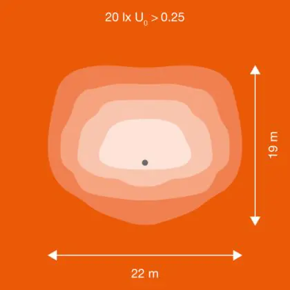Beispiel: Wird eine Lampe mit einem Abstrahlwinkel von 60 Grad an der Decke (2,5 m Höhe) angebracht, erzeugt sie einen Lichtkegel von 2,9 Metern Durchmesser. Hat die Lampe hingegen einen Abstrahlwinkel von 120 Grad, beträgt der Lichtkegel 8,7 Meter im Durchmesser. |