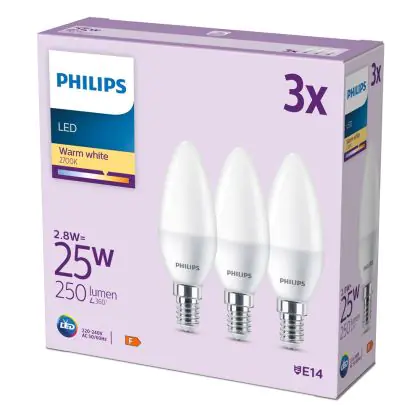 | Herstellername | Box 3 stuks - Philips LED Kaarslamp Mat - 25 W - E14 - Warmwit licht | |