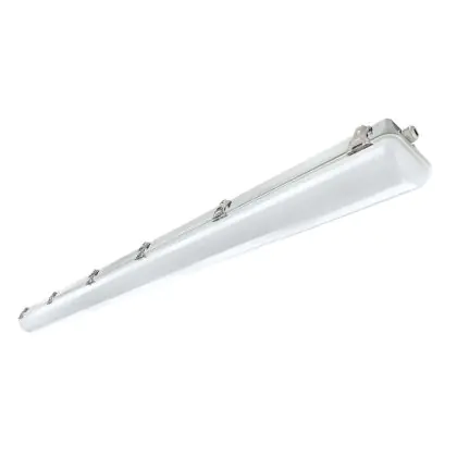 Die Noxion LED-Feuchtraumleuchte der Reihe Pro ist 150 cm lang. Sie ersetzt zwei herkömmliche Leuchten à 58 Watt und benötigt dabei selbst lediglich 1x 58 Watt. Diese LED hat eine tageslichtweiße Farbtemperatur (6.500 Kelvin) und kann über DALI gedimmt werden. Sie ist IP66- und IK08-klassifiziert und kann daher sowohl innen als auch außen angebracht werden. Dank der praktischen Durchgangsverdrahtung können Sie ganz einfach mehrere Leuchten miteinander verbinden.