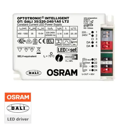 Das Panel hat einen DALI-kompatiblen LED-Treiber der Marke Osram. Über das sogenannte Digital Addressable Lighting Interface steuern Sie automatisiert Treiber, Vorschaltgeräte und Sensoren. Dadurch wird die Beleuchtung in festgelegten Bereichen nur bei Bedarf eingeschaltet und so zusätzlich Energiekosten reduziert. Über DALI hat das Panel zudem eine Dimmfunktion. So senken Sie Ihren Stromverbrauch zusätzlich, denn die Leuchte benötigt weniger Energie, umso weiter sie gedimmt wird.