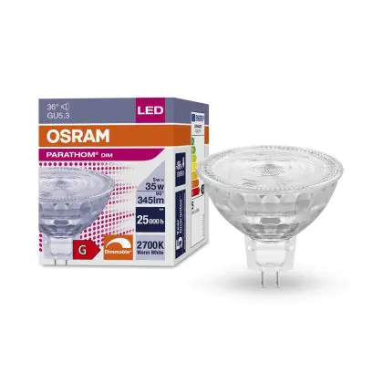 Die Osram Parathom LED GU5.3 Spot Klar 5W 345lm - 927 Extra Warmweiß | Dimmbar - Höchste Farbwiedergabe - Ersatz für 35W ist eine effiziente GU5.3 LED-Lampe und der perfekte Ersatz für Ihre konventionelle Halogenlampe mit 35W und einem GU5.3-Sockel, bei dem die beiden Stifte einen Abstand von 5,3 mm zueinander haben. Die Abkürzung MR16 zeigt Ihnen, dass der Reflektor einen Durchmesser von 5 cm hat. Zudem strahlt das Produkt Licht in der Farbtemperatur 2700K - Extra Warmweiß aus und punktet durch eine lange Lebensdauer.