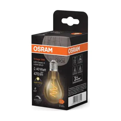 Die Osram Vintage 1906 LED Classic Slim E27 Birne Fadenlampe Gold 4.9W 470lm - 927 Extra Warmweiß | Höchste Farbwiedergabe - Dimmbar - Ersatz Für 40W ist eine effiziente E27 LED-Lampe mit Retrodesign und der perfekte Ersatz für Ihre konventionellen 40W Lampen mit E27. Zudem strahlt sie Licht in der Farbtemperatur 2700K - Extra Warmweiß aus und punktet durch eine lange Lebensdauer.