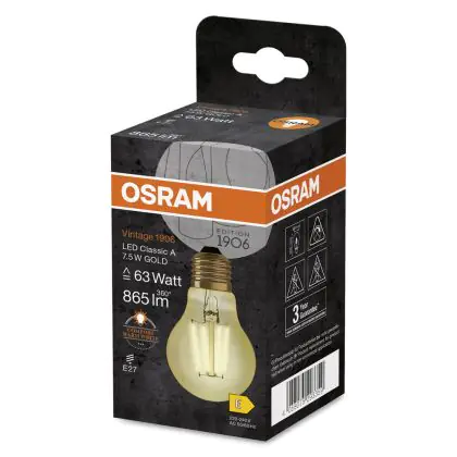Die Osram Vintage 1906 LED E27 Birne Fadenlampe Gold 7.5W 865lm - 825 Extra Warmweiß | Ersatz Für 60W ist eine effiziente E27 LED-Lampe mit Retrodesign und der perfekte Ersatz für Ihre konventionellen 63W Lampen mit E27. Zudem strahlt sie Licht in der Farbtemperatur 2500K - Extra Warmweiß aus und punktet durch eine lange Lebensdauer.