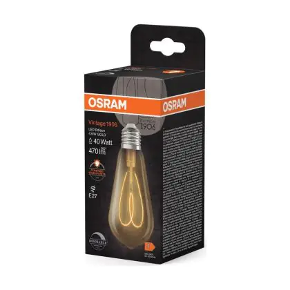 Die Osram Vintage 1906 LED E27 Edison Fadenlampe Gold 4.9W 470lm - 922 Extra Warmweiß | Höchste Farbwiedergabe - Dimmbar - Ersatz Für 40W ist eine effiziente E27 LED-Lampe mit Retrodesign und der perfekte Ersatz für Ihre konventionellen 40W Lampen mit E27. Zudem strahlt sie Licht in der Farbtemperatur 2200K - Extra Warmweiß aus und punktet durch eine lange Lebensdauer.