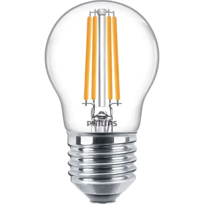 Die Philips Corepro LED Lustre E27 Kugel Fadenlampe Klar 6.5W 806lm - 827 Extra Warmweiß | Ersatz für 60W ist eine effiziente E27 LED-Lampe mit Retrodesign und der perfekte Ersatz für Ihre konventionellen 60W Lampen mit E27. Zudem strahlt sie Licht in der Farbtemperatur 2700K - Extra Warmweiß aus und punktet durch eine lange Lebensdauer.