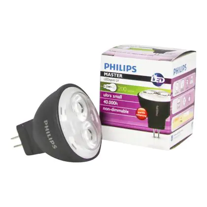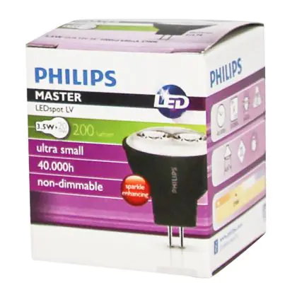 Die Philips Master LED Spot GU4 MR11 3.5W 200lm 24D - 827 Extra Warmweiß | Ersatz für 20W ist eine effiziente GU5.3 LED-Lampe und der perfekte Ersatz für Ihre konventionelle Halogenlampe mit 20W und einem GU5.3-Sockel, bei dem die beiden Stifte einen Abstand von 5,3 mm zueinander haben. Die Abkürzung MR16 zeigt Ihnen, dass der Reflektor einen Durchmesser von 5 cm hat. Zudem strahlt das Produkt Licht in der Farbtemperatur 2700K - Extra Warmweiß aus und punktet durch eine lange Lebensdauer.