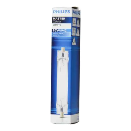 CDM-TD sind zweiseitige kompakte Entladungslampen mit einem brillanten Licht und ausgezeichneter Farbstabilität aufgrund ihrer Keramik-Brenner-Technologie. Die Philips CDM-TD 70W 942 RX7s (MASTERColour) besitzt einen RX7S Gasentladungslampensockel. Diese Lampen sind nicht dimmbar.