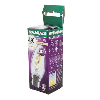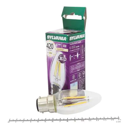 Die Sylvania ToLEDo Retro Candle B22 ist eine sehr effiziente LED-Lampe. Ihr Verbrauch beläuft sich auf lediglich 4 Watt. Gleichzeitig bietet sie jedoch Ersatz für ein traditionelles Leuchtmittel von 40 Watt. Damit sparen Sie 90 % Ihrer sonstigen Energiekosten ein. Die LED besitzt einen B22-Sockel und ist in Kerzenform erhältlich. Sie spendet extra warmweißes Licht mit einer Farbtemperatur von 2.700 Kelvin.