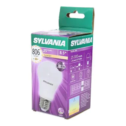 Die Sylvania ToLEDo GLS E27 ersetzt traditionelle Leuchtmittel von 60W, ist dabei aber wesentlich effiziente im Verbrauch mit nur 8,5 W. Darüber hinaus besitzt sie eine extra warmweiße Farbtemperatur und sorgt damit für eine entspannte Atmosphäre.