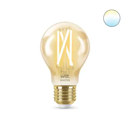 Die WiZ Smart LED E27 Birne A60 Fadenlampe Gold 7W 640lm | Höchste Farbwiedergabe - Dimmbar - Ersatz Für 50W ist eine effiziente E27 LED-Lampe mit Retrodesign und der perfekte Ersatz für Ihre konventionellen 50W Lampen mit E27. Zudem strahlt sie Licht in der Farbtemperatur aus und punktet durch eine lange Lebensdauer.